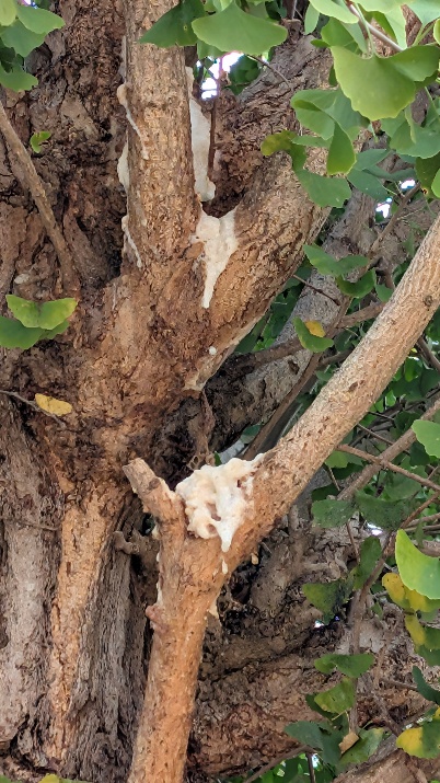 イチョウの幹の枝分かれの付け根に、大量の白い泡が洗剤の泡のように付き、大量のカナブンが集まると同時に、地面には、樹液らしきものが落ちており、その上、アブかハチが数匹死んでいます。これはいったい何でしょうか。匂いは銀杏の匂いがします。イチョウの幹に泡