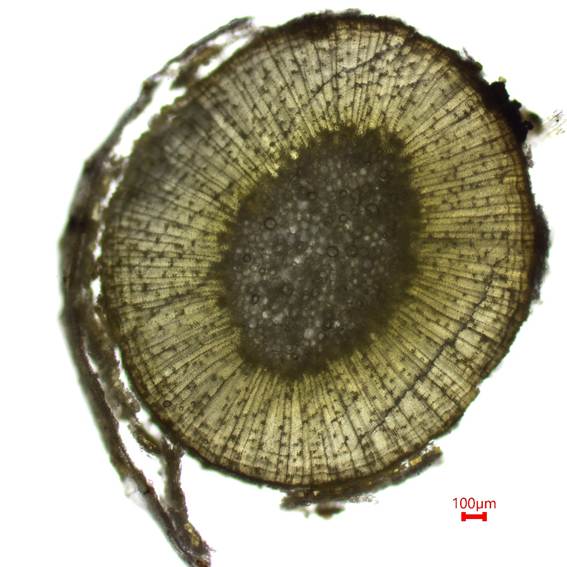 一方で老化した刺を切断して観察すると、表皮は大半が剥がれおち、皮層細胞が疎らに残ることで、頂いたスケッチのように部分的な盛り上がりがあるように見えます。