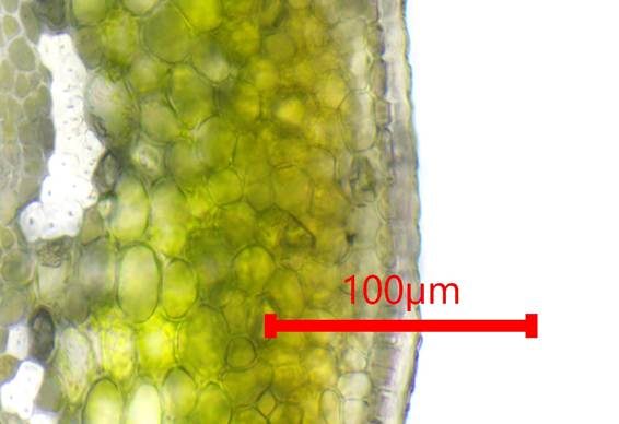 ただ、ミカン科の刺が本当に多層表皮をもつかという点に関しては、可能性はあるかもしれないとも思いました。若い時の刺の表皮付近を拡大して見るとぶ厚いワックス層の下に薄い表皮細胞ともう一層葉緑体がほとんど発達しないように見える細胞も確認できます。これが表皮細胞由来の細胞層なのか、単に葉緑体の発達の乏しい皮層組織の柔細胞なのかは、単純な観察だけでは判断が難しいです。
