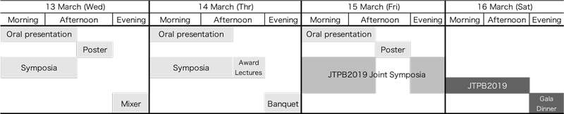 - We actively encourage presenters to hold symposia in English in order to make the meeting more international. JSPP is planning to have funding available for supporting several symposia in English (up to ¥300,000 per symposium). For details, Please contact the Annual Meeting Committee Office (jspp2019@nacos.com) if more information is required.